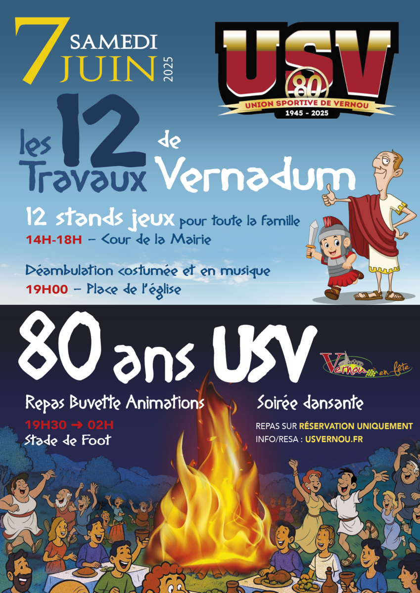 - 20h - Stade de foot - "Le grand banquet et le spectacle enflamé de Vernadum", suivi d'une soirée dansante jusqu'à 2h du matin ! - organisé par nos amis de Vernou en Fête !